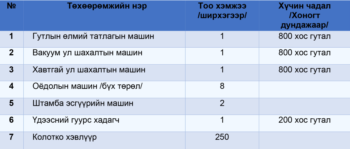 Бидний үйлдвэрлэлдээ ашиглаж буй гол багаж, тоног төхөөрөмжүүдийн жагсаалт болон модель: